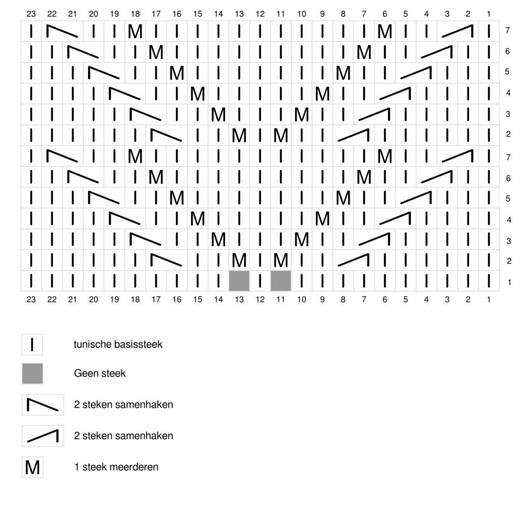 Elke zigzag is gehaakt op 19 tunische basissteken. Door de zigzags boven elkaar te haken ontstaan kolommen van zigzags. Tussen de kolommen haak je steeds 1 tunische basissteek. Alle teruggaande toeren werk je af op de normale manier.
