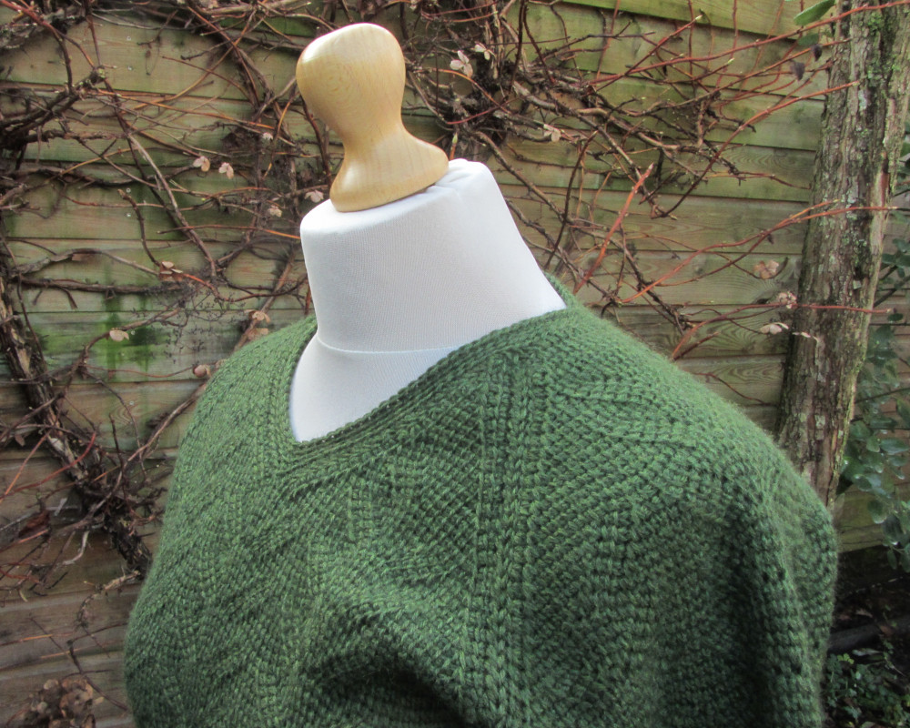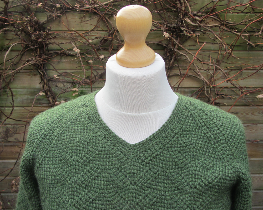 Voor het model is geen patroon gebruikt. Als voorbeeld is een bestaande trui gebruikt. Aan de hand van een proeflapje is uitgerekend hoeveel steken nodig waren. Daarbij is er rekening mee gehouden dat het werk uitrekt door het spannen (blocken). Je kunt het beste ook het proeflapje eerst spannen en daarna het stekenaantal uitrekenen.