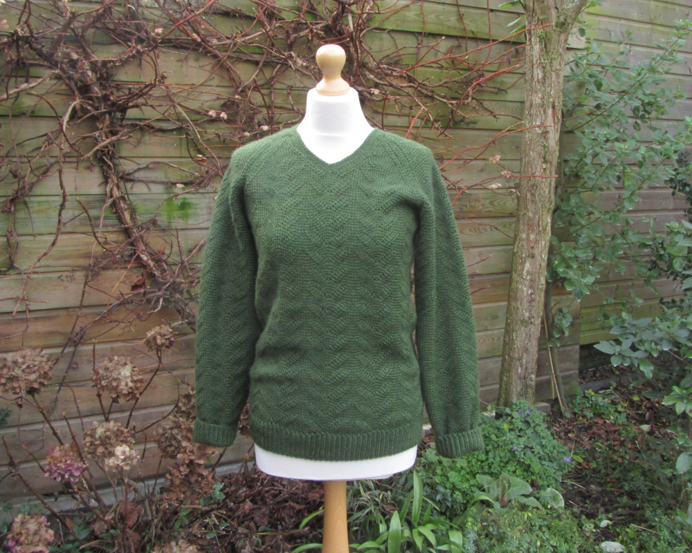 Deze warme wintertrui heeft raglanmouwen en is gehaakt in een zigzagmotief. De gebruikte steek is de tunische basissteek. Het zigagmotief ontstaat door steken samen te haken en steken te meerderen.