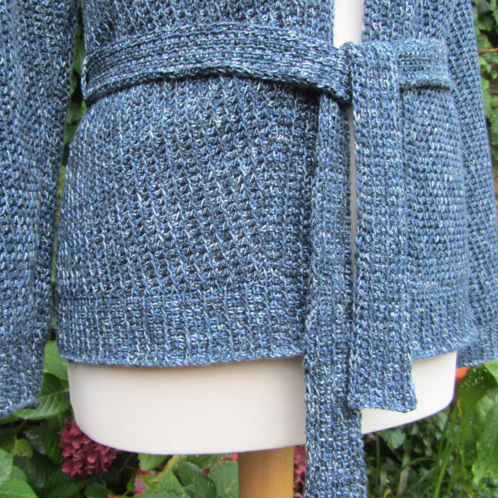 Dit tunisch gehaakt vest is wat langer en wordt met een ceintuur getailleerd. Het is gehaakt met een katoenen garen, met tunische haaknaald 4,5 (aanbevolen haaknaald voor gewoon haken is 2,5-3). Voor de boorden is naald 4 gebruikt. Er zijn 14 bollen van 50 gram gebruikt (ong. 125 m per bol) voor maat S.