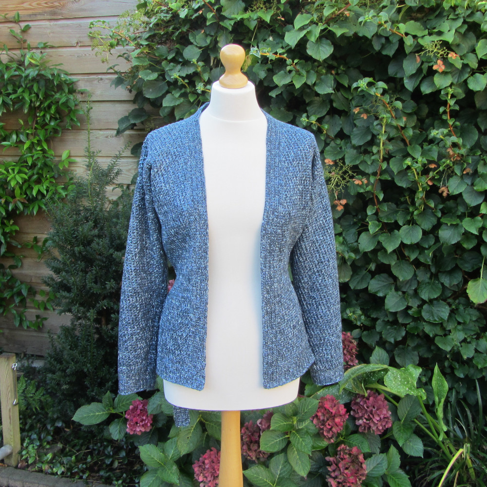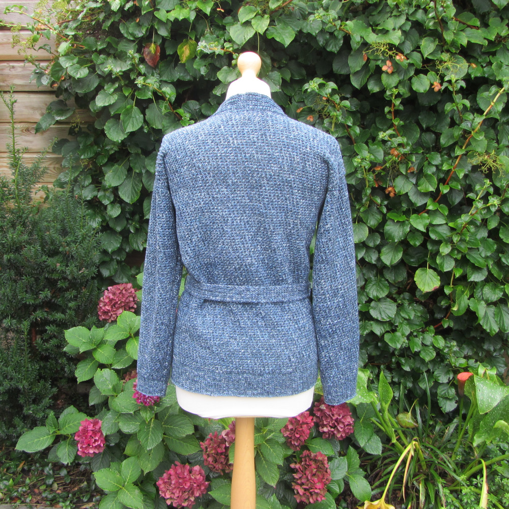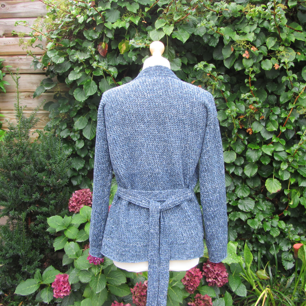 Alle delen zijn geblockt (gespannen) voor het vest in elkaar is gezet. De boorden bij de schouders blijven los. Daarop is verder gehaakt in boordpatroon tot aan middenachter van de rug. De 2 boorddelen zijn aan elkaar gezet en vastgezet aan het rugpand.