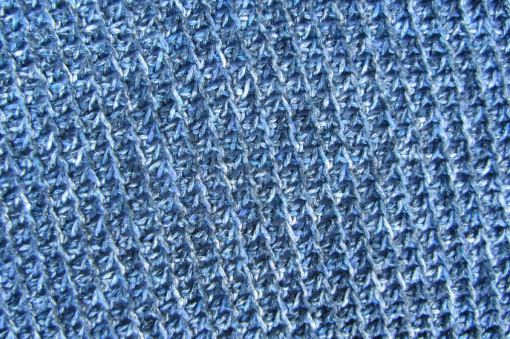 Een uitgebreidere beschrijving van het motief staat hier: Tunisch haken: ajourmotief. Daar staat ook een instructievideo. Doordat je met dikker garen haakt, is het ajourmotief in het vest veel minder zichtbaar.